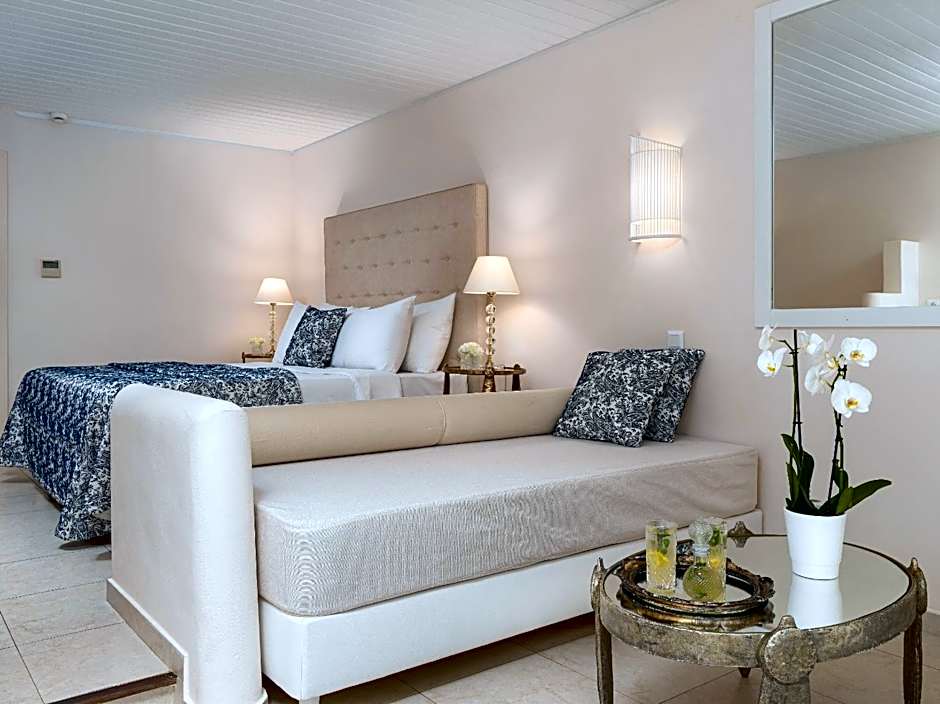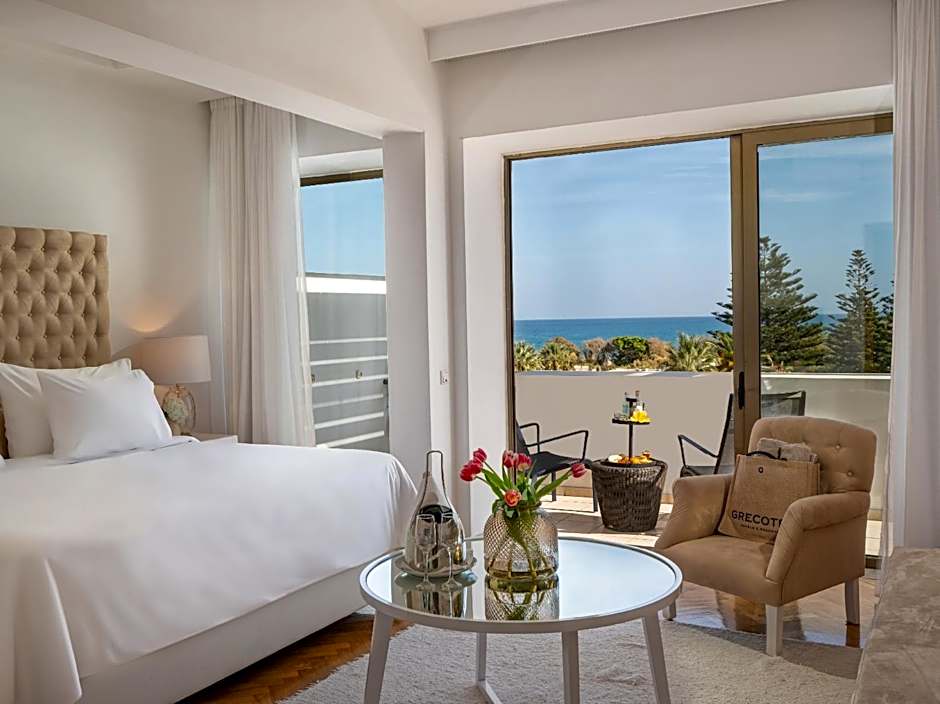 Generously appointed guest rooms with exclusively manufactured, luxurious furnishings. It features a lounge and dining area with LCD TV with satellite channels, spacious floodlit wardrobes and a luxury all marble bathroom with 2 sinks, separate WC and telephone. From the balcony, with its romantic furniture, guests will discover the breathtaking view over the sea.